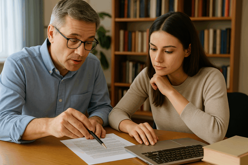 Tutor revisando tesis universitaria con una estudiante en biblioteca, corrigiendo errores en conectores académicos.