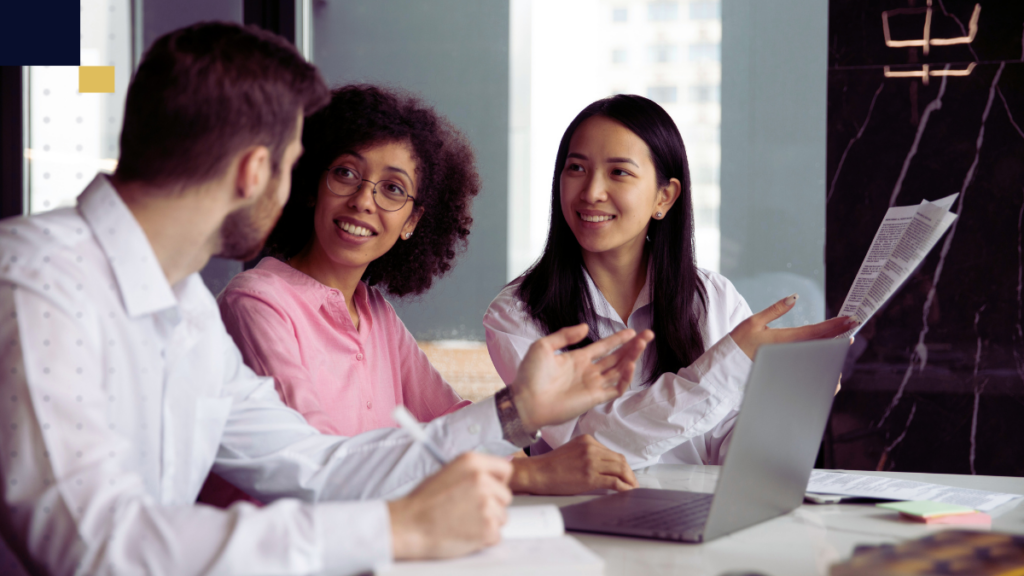 Tres personas adultas dialogando y revisando documentos frente a una laptop, colaborando en la planificación de un proyecto académico multidisciplinario.