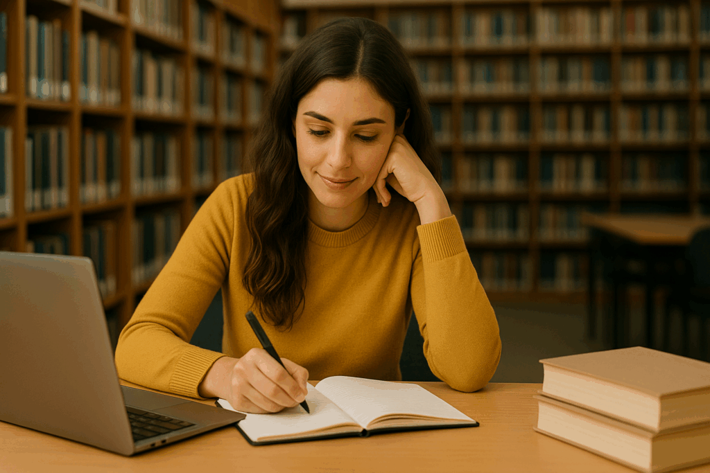 Estudiante redactando su tesis en la biblioteca con laptop y cuaderno