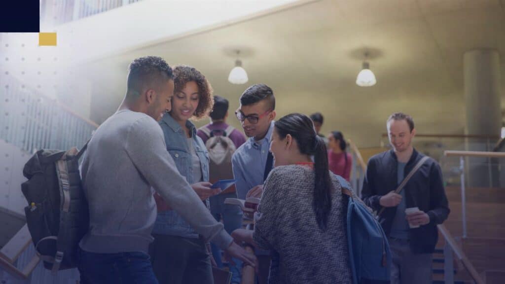 Estudiantes universitarios conversando y compartiendo información en un pasillo, ilustrando la propagación de la muestra en el muestreo bola de nieve.