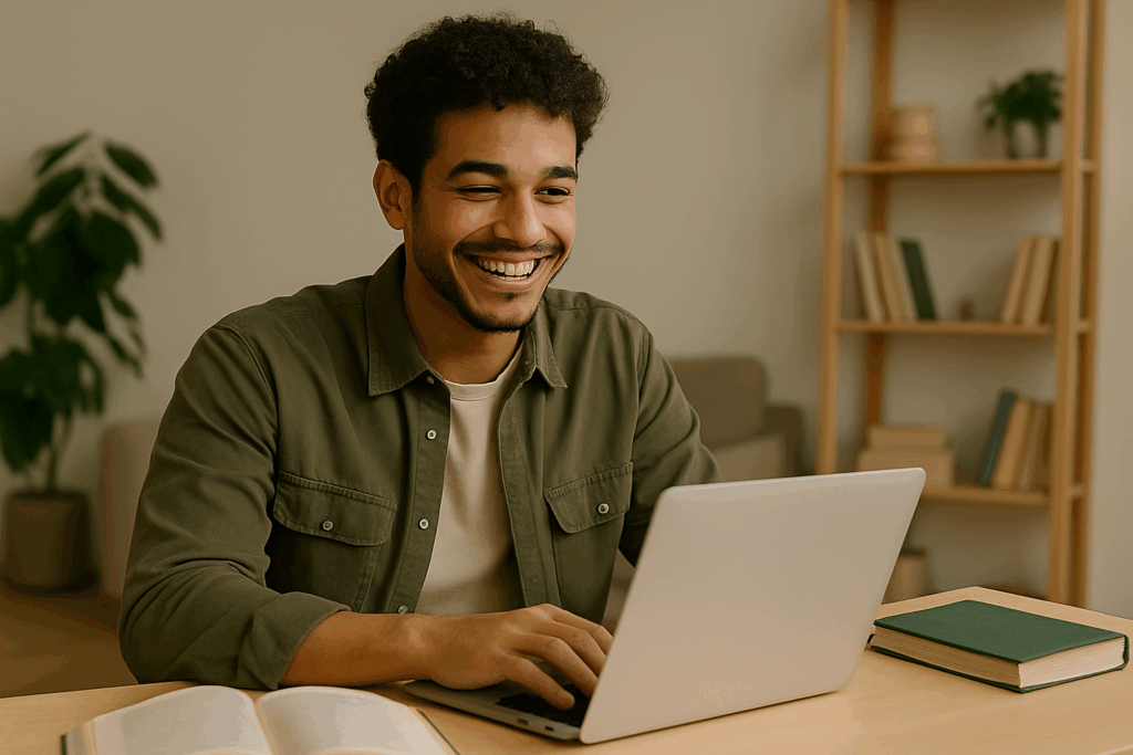 Estudiante universitario sonriente frente a su portátil mientras trabaja en su proyecto de grado
